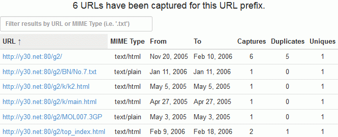 看看这个页面:https://web.archive.org/web/*/http://y30.net/g2/*,很清楚的显示了该域名下有6个网页/文件快照。