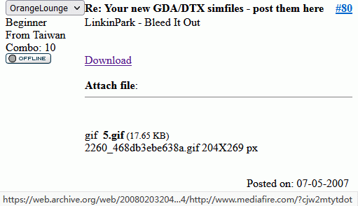 感觉有点沉重了,这段掐了憋播-__,-|||来个值得高兴的,各位先看看这个帖子:Your new GDA/DTX simfiles – post them here 很显然,07年的帖子,网站坟头草都几十米高了,结果拉到最下面那首LinkinPark – Bleed It Out,这TM居然还能下!!!!此时我就要重复一下标题了:MediaFire,永远的神!!我都想基于存活度做个现役国外网盘从夯到拉排行榜了,这MF绝对是夯中夯,无论再老的帖子,只要看到MF链接,就有一线生机!!虽然这站的批量下载就是彻底的灾难,但东西能长时间存下来才是王道啊!!!!顺便一说杰必中的杰必一定是OneDrive,不接受任何反驳-__,-|||