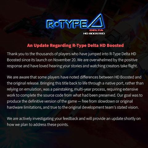 这篇公告,堪比本年度,甚至整个移植游戏界最不要脸的言论。他们居然敢把一款没能完美移植处理落、同时完全不处理音乐与画面演出同步的STG,自我洗地成”free from slowdown or original hardware limitations, and true to the original development team’s stated vision.”?M2为了能完美复刻各种游戏原版的处理落,经常花大量的时间逐帧进行对比,这种执着和玩家的期待,岂不是被他们一句话就贬为无物?如此的无知和自负,就是对怀旧玩家的侮辱,更是对移植游戏界的亵渎,我不得不对他们说:你说的对,因为我透你们老母的时候也没有处理落。