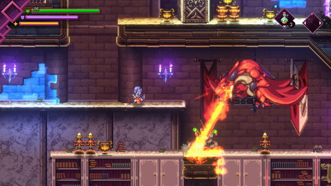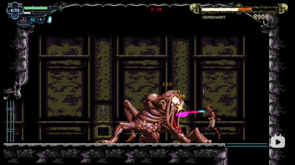 而相比恶魔城本家,则反向追加了一种“最速起跳斩”的技巧,即同时按下跳跃和出刀,系统可以优先出跳并第一时间低空挥刀,其攻击判定高度几乎和地面挥刀一致,因此能打中很矮的敌人,玩家只要掌握好时机,就可以反复最速起跳斩→空中斩→落地取消的循环,且保持自由移动。这正是在理解恶魔城设计思维的基础上做的一次形式探索实验,除了想法可圈可点,在投入实践上显然也下了苦工:因为要实现最速起跳斩,必然要在按键优先级与输入缓冲上进行大量调试。像这种站在巨人肩膀上、符合整体框架的进一步拓展,才是值得肯定的。