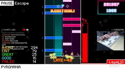 其实不难发现如今的这类泛音游设计思路已经越来越狭隘,融合的方式过于生硬,音游玩法只起到在操作层面增加限制的作用,说到底根本是可有可无。就像PSV上那个《Magical Beat》,音游成分说到底只起到徒增难度的作用,甚至游戏里面直接就给了你不用按节奏按键的模式;《PATAPON》把节奏按键换成搓招也无所谓,连搓十次成功进FEVER,可以美名其曰泛格斗游戏;甚至《伊甸之子》也是,按照节奏打只起到增加分数的作用,否则就是纯光枪游戏,之所以优秀还是源于关卡、演出、音乐本身的高素质。而像《IS: Internal Section》《Rez》这些游戏,玩法和音游更是完全无关,只是从关卡设计、敌人配置上对接节奏的概念,使得你本身不需要音游玩法也能具备强烈的音乐互动感。当然,在下面某垃圾音游都能堂而皇之地面世的今天,你也不能期待泛音游还能做出如何的新意了。